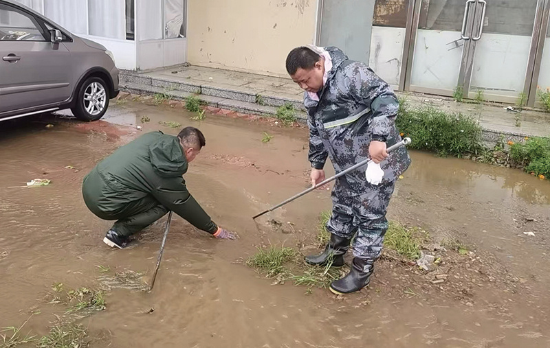 진흥구 승리가에서는 물이 고였으나 방류인원들이 제때에 잡동사니를 치웠다.