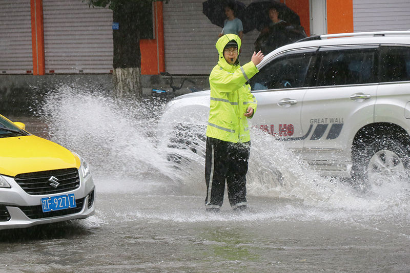 16일 오전 7시, 교통경찰 조가서가 비속에서 교통을 지휘하고 있다.