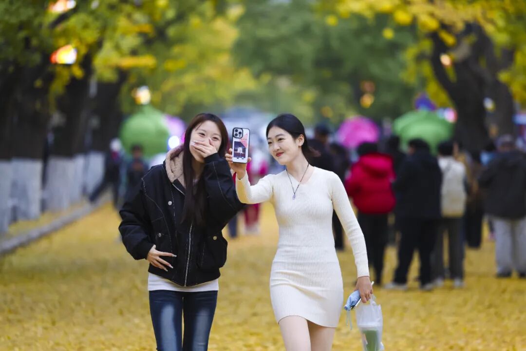 10월 29일, 가랑비가 그친 뒤 공기가 한결 상쾌해졌다. 구위로 량쪽의 은행나무는 잎이 무성하게 우거졌고, 황금빛 잎들이 산들바람에 살랑살랑 흔들리고 있었다. 비에 젖은 은행나무 잎은 색이 더욱 선명해졌고, 길바닥에 쌓인 락엽은 마치 ‘황금 융단’을 펼쳐놓은 듯했다.