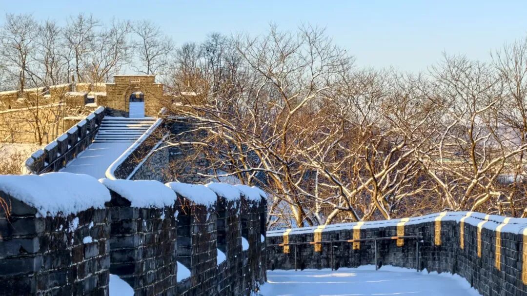 12월 23일 내린 눈이 료동 명대장성의 동단 기점인 호산장성에 하얀 옷을 입혔다. 성벽과 산체가 적설로 덮이며 고요한 겨울 풍경을 자아냈다.