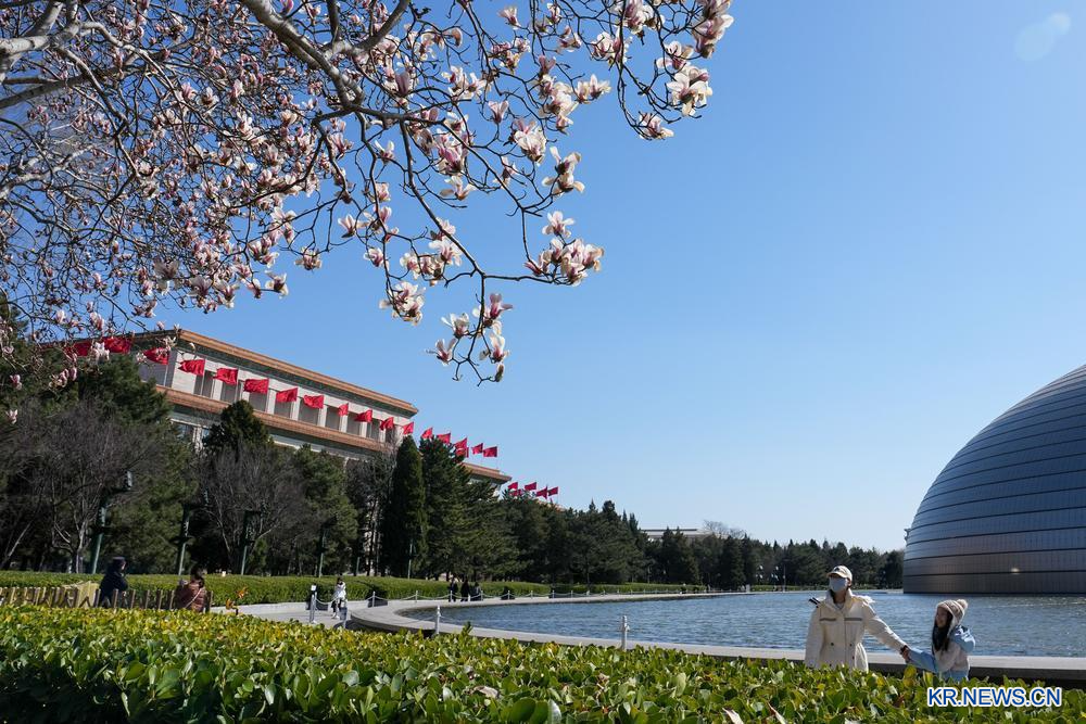 관광객이 9일 중국 국가대극원 옆에서 만개한 목련을 카메라에 담고 있다.