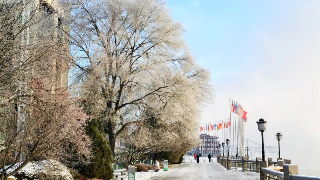 해빛 아래 얼음 결정들이 빛을 반사하며 강물과 함께 반짝였다. 압록강반의 빈강로와 압록강공원 일대의 나무들은 얼음 결정으로 덮여 시민들과 사진 애호가들이 이 드문 아름다운 풍경을 감상하기 위해 모여들었다.