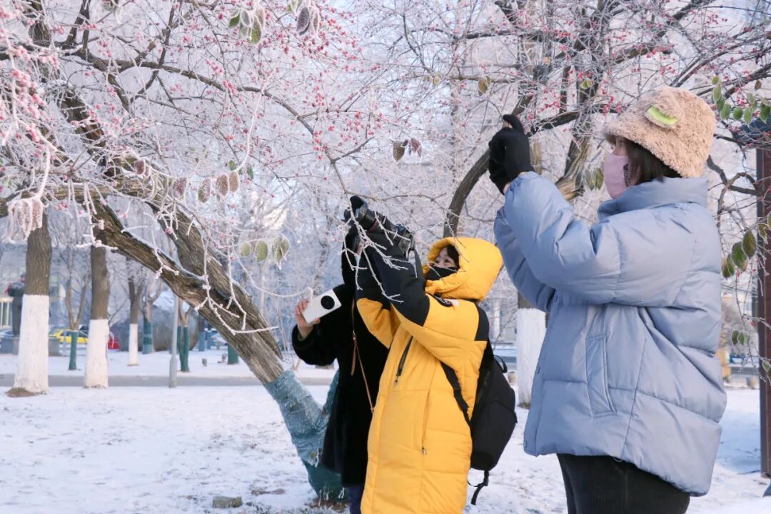 ‘아침에 창밖을 보니 하얀 세상이 펼쳐졌어요. 알고 보니 무송이었네요. 너무 아름다웠어요!’라고 빈강로에 사는 리씨는 말했다. 아침 운동을 하던 많은 시민들이 발걸음을 멈추고 이 귀한 풍경을 기록했다.