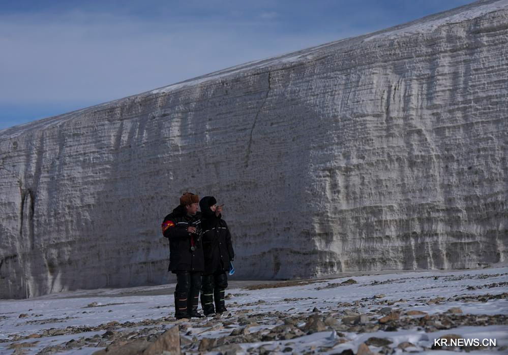 청해성 해북장족자치주 기련현에 위치한 팔일빙하의 일각을 12일 무인기의 촬영사진에 담았다.