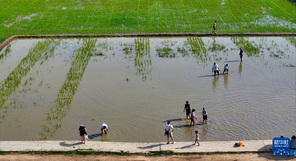 6月18日,游客在稻渔空间乡村生态观光园参与稻田抓鱼(无人机照片)。