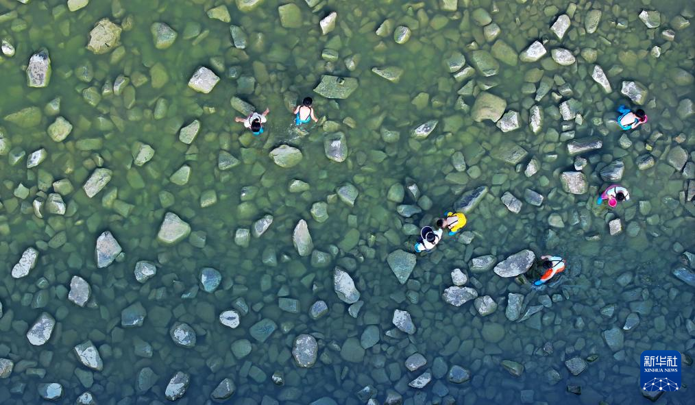 6月18日,游客在稻渔空间乡村生态观光园戏水(无人机照片)。