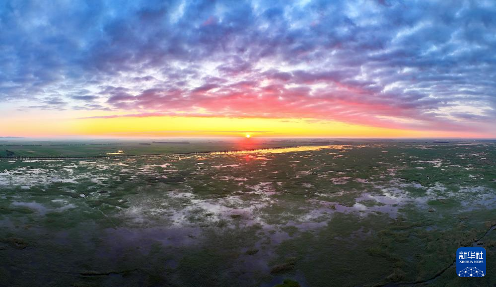 7月13日拍摄的朝霞掩映下的黑龙江三环泡国家级自然保护区(无人机全景照片)。