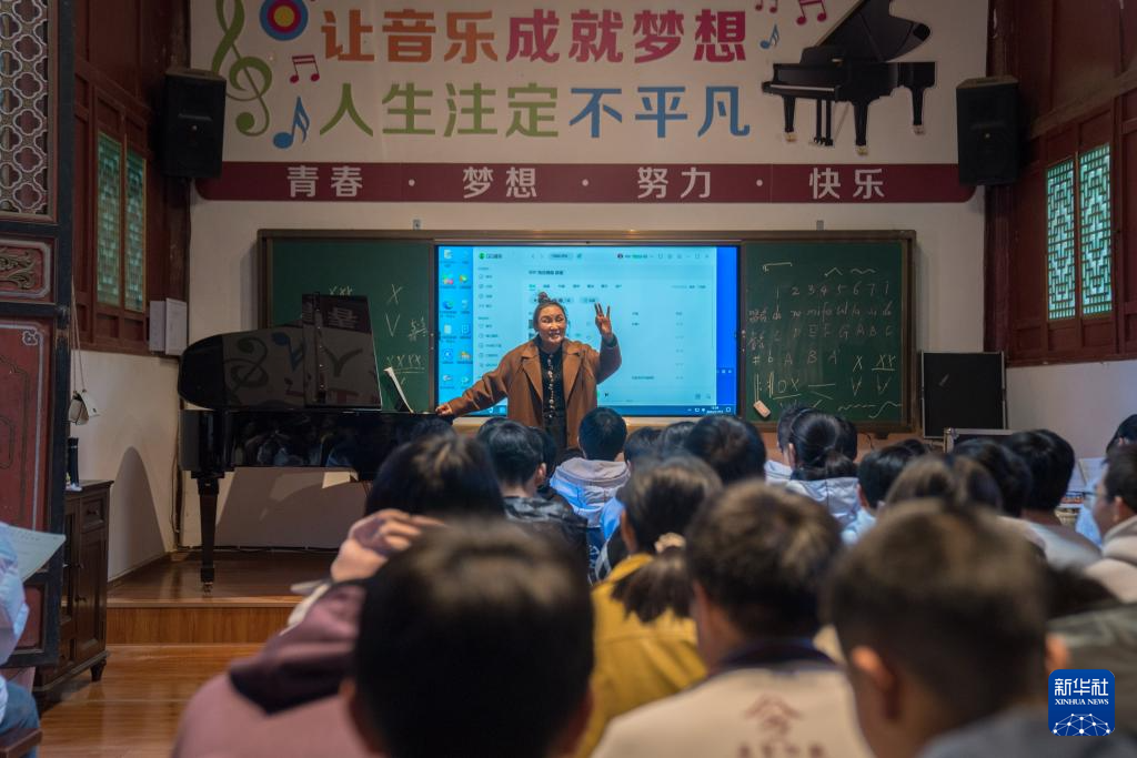 11月12日,在云南省会泽县第一中学,老师在给学生上音乐课。
