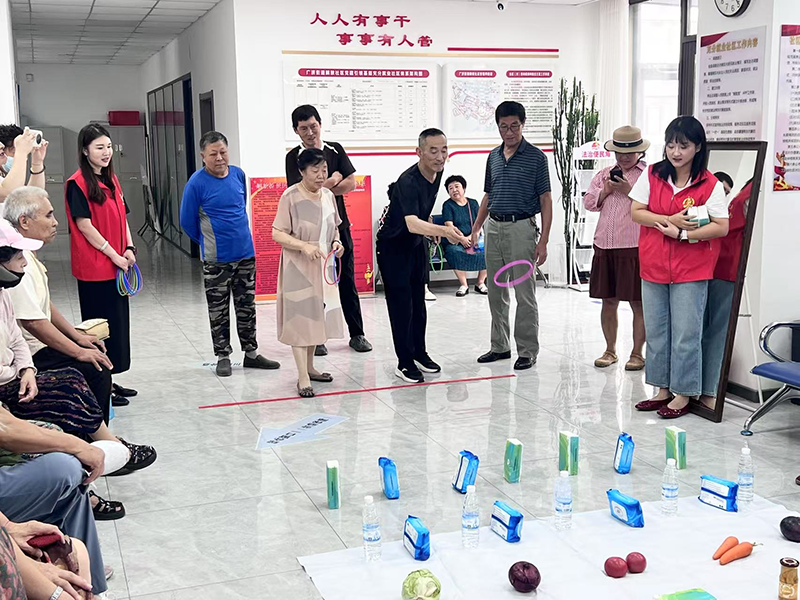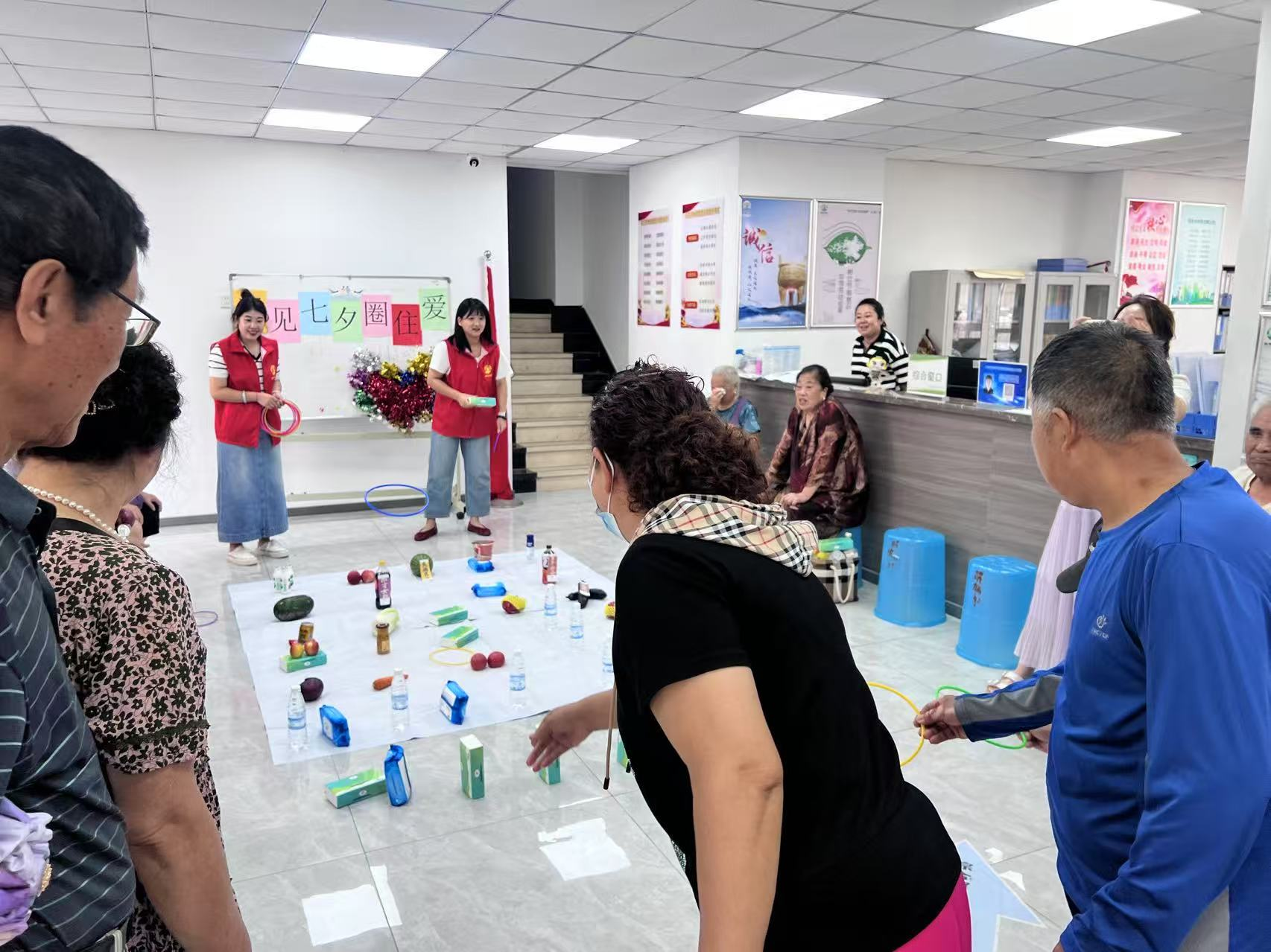 七夕前夕,元宝区广济街道解放社区、平安社区、新丰社区组织6对金婚老人代表、居民、党员共同开展“遇见七夕 圈住爱”趣味套圈活动。