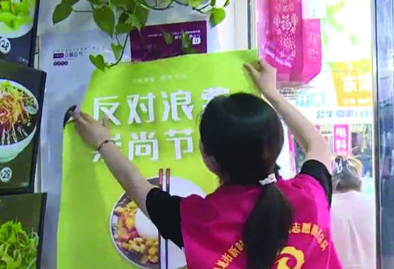 在“弘扬节俭美德,共建文明餐桌”活动中,志愿者走进餐饮店铺,发放文明餐桌公示牌,张贴反对浪费、崇尚节约海报,倡导大家做文明餐桌的践行者、推动者。