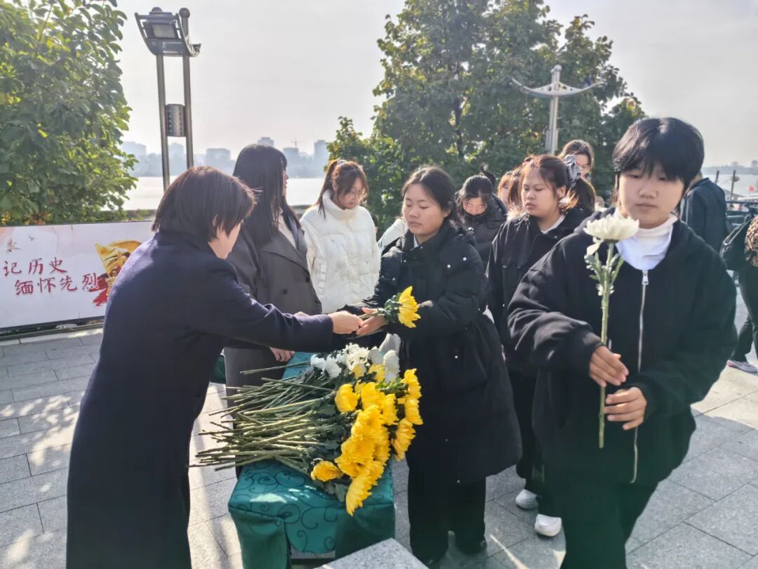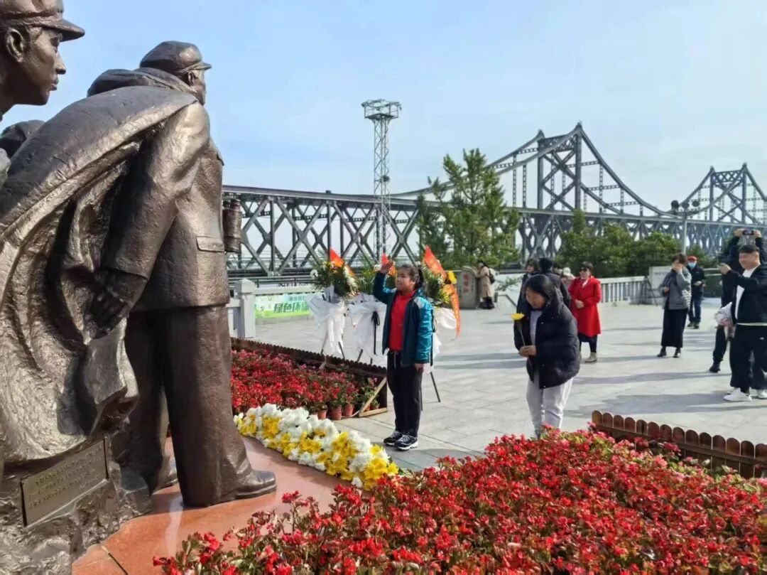 9点30分,景区工作人员、商旅边境派出所民警、辽东学院纺织服装学院师生、游客向英雄群雕鞠躬,敬献花束,以此纪念在抗美援朝战场壮烈牺牲的志愿军先烈。