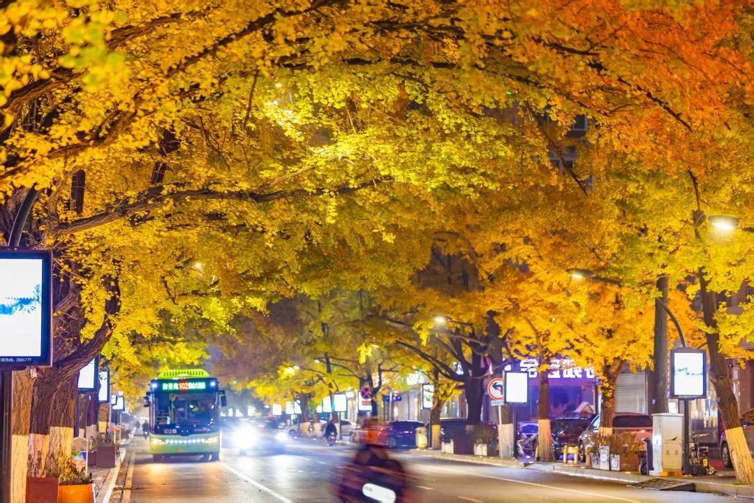 夜幕降临后,城市灯火与金黄银杏叶交相辉映,七经街、九纬路等核心路段化身浪漫打卡地,吸引市民与游客争相定格这份秋日限定美景。