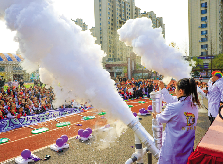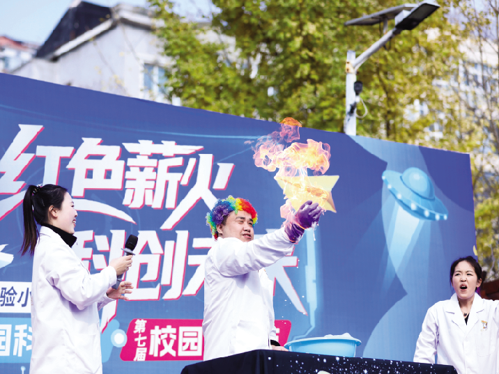 开幕式上,科学实验秀将现场气氛推向高潮:老师手持空气炮装置,轻轻拉动球膜,一股无形气流精准击倒前方纸杯,让学生们直观感受流体力学的奥秘;当零下196℃的液氮注入炮体,高压喷射出的白色雾柱席卷全场,极寒与炽热的碰撞造就了“冰临城下”的视觉狂欢。最震撼的当属火焰掌表演,老师将盛满丁烷气体的肥皂泡托在手心,点火瞬间火焰腾空却不伤自己分毫,水膜隔热与瞬时燃烧的科学原理让学生们啧啧称奇。