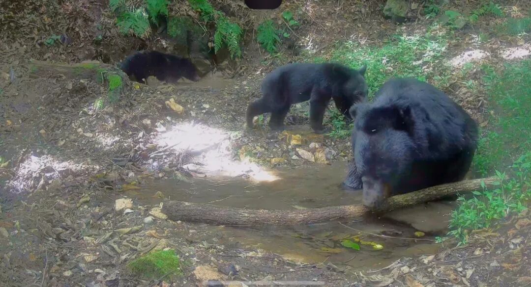更令人惊喜的是,镜头还罕见地记录下了黑熊一家温馨的同框画面。一只大熊带着两只可爱的熊宝宝,在水塘中尽情嬉戏。它们或笨拙地划水,或亲昵地互动,花式玩水的憨萌模样“犯规”般地触动人心,展现了猛兽背后不为人知的温情一面。还有两头酷似熊大、熊二的健壮黑熊,大摇大摆地在红外相机前走过,视觉压迫感扑面而来。