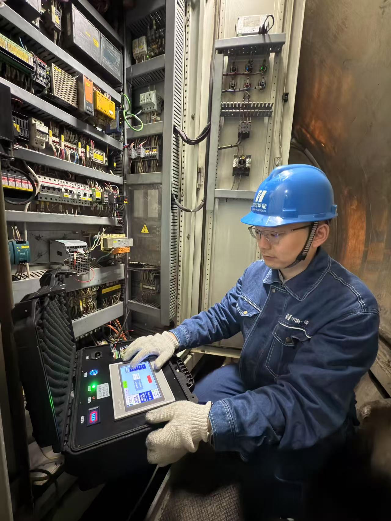 眼下正值冬季供电高峰,为保障稳定供电,应对大风天气可能对设备运行带来的挑战,华能新能源辽宁分公司阜北风电场对风电机组开展超速保护专项检测。技术人员通过模拟转速信号,验证超速保护系统能否准确、迅速启动刹车,保障机组安全运行。此类定期检测是保障风电机组在用电高峰期间稳定供电的关键。目前,阜北风电场共建有257台风机,日均发电量达400万千瓦时。图为技术人员正在检测设备。
