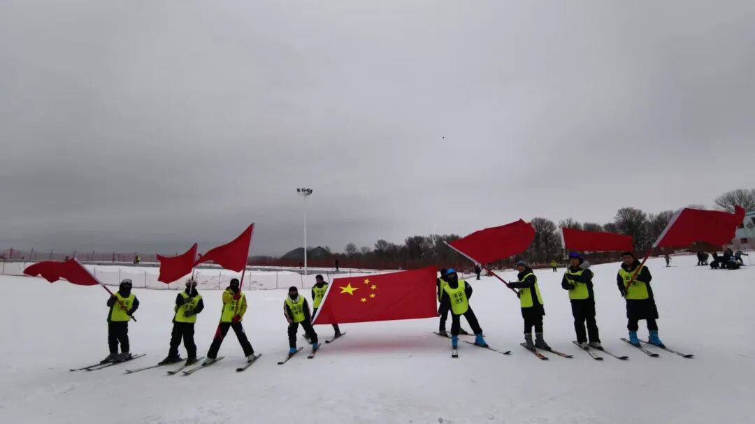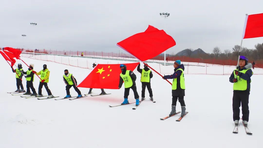 舞台上,秧歌舞蹈《俏》以欢快的节奏瞬间点燃气氛。身着统一服装的滑雪教练团队,护送着巨幅国旗,自雪道高处滑下,引得现场观众阵阵欢呼。