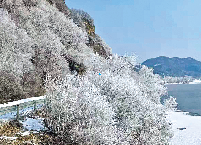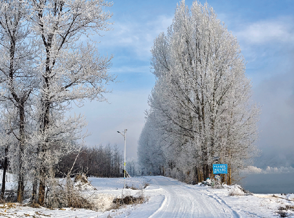得天独厚的地理环境,孕育出大牛沟雾凇独有的灵秀与晶莹。凝霜挂雪的草木,尽显造化之奇:垂柳裹素,绽放出朵朵玲珑银花;松柏披霜,雕琢成簇簇雅致玉菊。清晨的薄雾尚未散尽,微风轻拂而过,枝头的雾凇簌簌飘落,似玉屑纷飞、似柳絮漫舞,置身其间,恍若闯入缥缈空灵的童话世界。