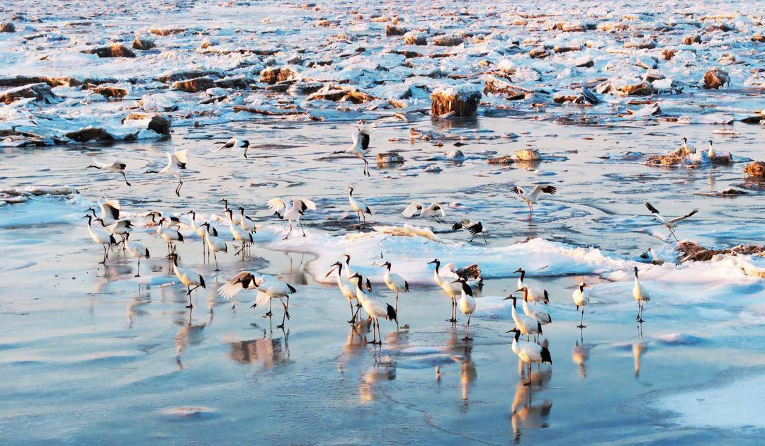 鹤群留守得益于气候与生态双重保障。入冬以来,气候呈现“偏暖偏湿”特征,平均气温较常年同期偏高2-3℃,湿地封冻时间较往年推迟近20天,核心区域仍保留大片未结冰水域,温暖的气候延长了湿地适宜栖息期,未结冰的水域为鹤类提供了稳定的觅食环境。同时,作为全国最大“退养还湿”单体工程实施地,辽河口湿地水系纵横,有丰富的生物资源,小鱼、小虾、甲壳类动物等鹤类天然食物储量较往年增加明显,为鹤类越冬提供了一座充足的“天然食堂”。