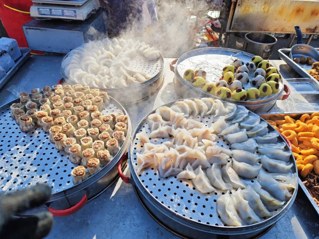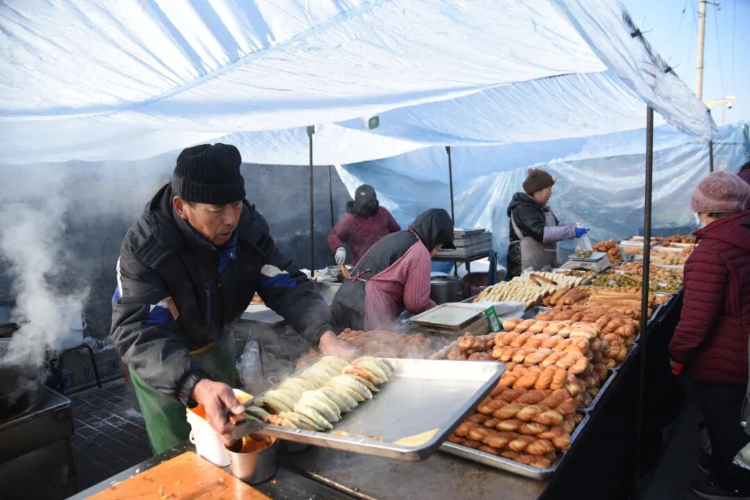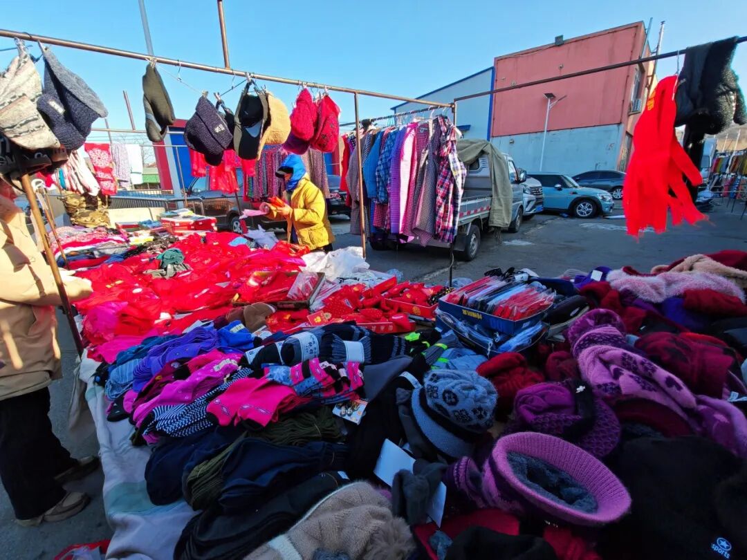 鸡冠子鲜红的跑山鸡、油锅里翻滚的麻团儿、现摊的玉米面煎饼、各类东北大花袄……从肉蛋熟食到生活用品,从五金杂货到服装鞋帽,琳琅满目,一应俱全,分分钟一站式备齐年货。