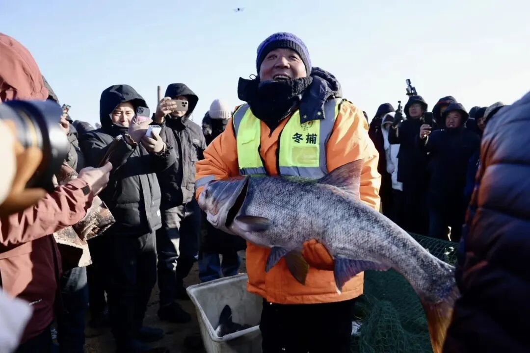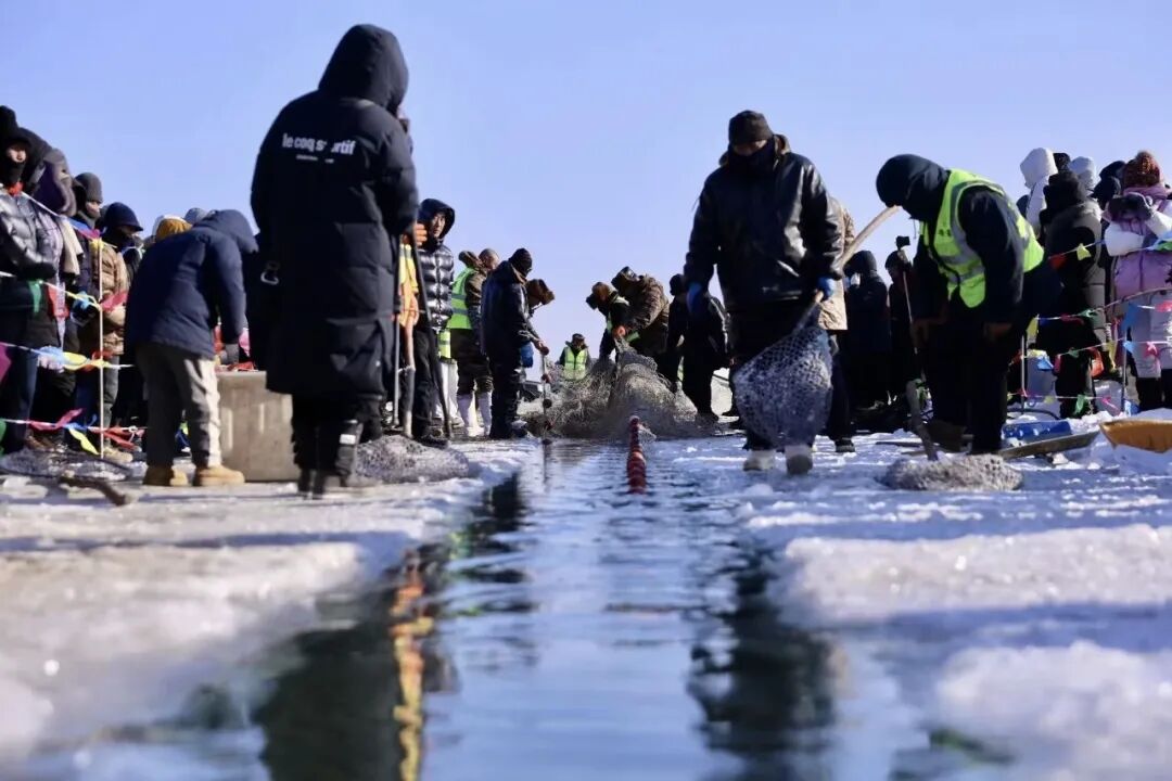 大洋河冰层如镜,映照着忙碌的身影。渔民们协力推动绞盘,渔网在冰下徐徐展开,拉开了今冬首场大规模冬捕的序幕。