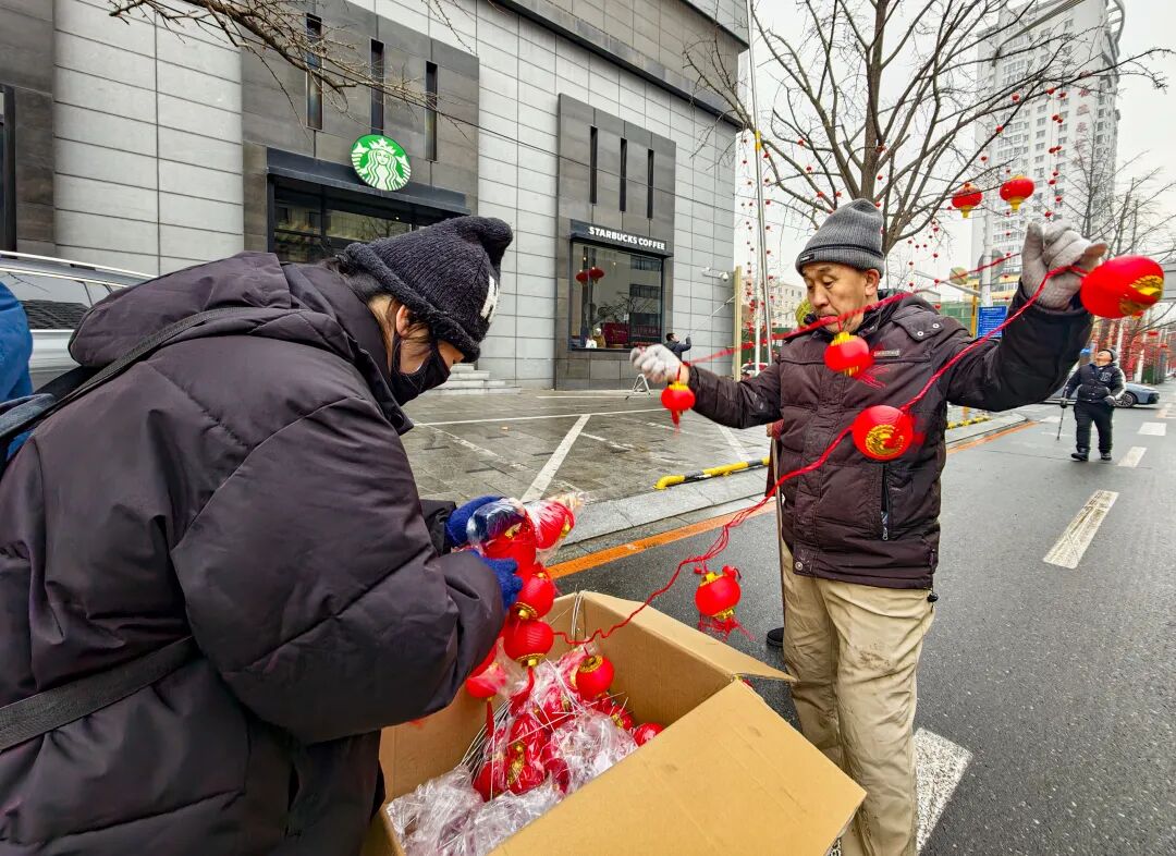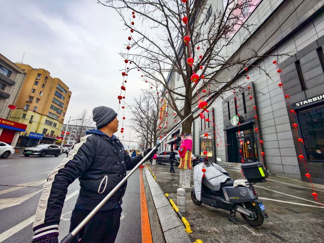 寒风中,红彤彤的灯笼经工作人员之手,依次“绽放”在银杏枝头,将冬日的萧瑟驱散,把新春的暖意传递。