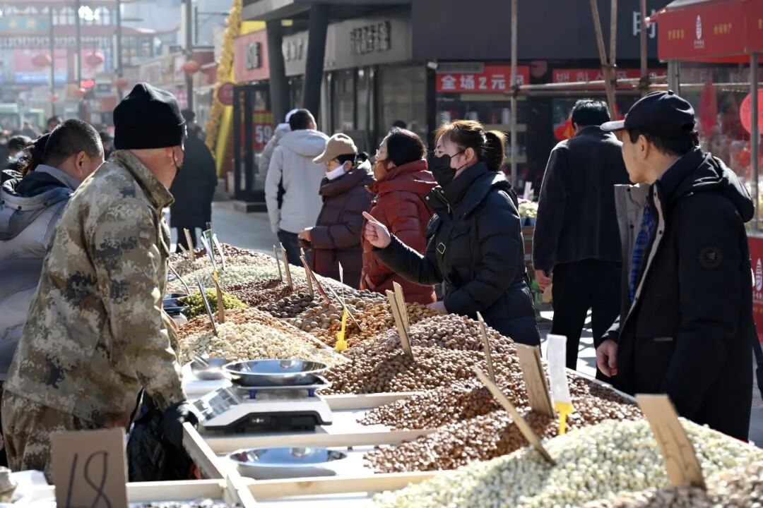 此时的新安步行街变成了年货集市,在干果摊前,人们围得水泄不通,开心果、巴旦木、腰果等干果堆成了小山,大家一边挑选,一边品尝,欢声笑语回荡在集市的上空。