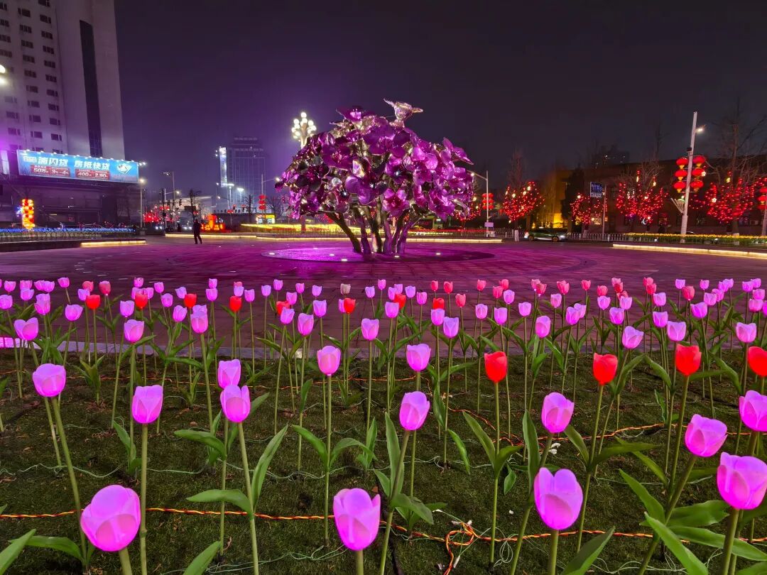 行走在城区街头,道路两侧树木挂满红灯笼与彩色灯带,霓虹交织、暖意融融。站前广场以草莓灯笼为特色,巧妙融合地域元素与新春吉祥寓意;和平广场矗立着巨型马形灯雕,气势恢宏,寓意马年奋进、前程似锦;月亮岛广场以“春”字主题灯雕,传递新春生机;杜鹃广场则以缤纷小彩灯营造温馨浪漫的光影氛围。一路一景、一广场一特色,传统年味与现代光影相得益彰,将边城夜晚装扮得美不胜收。