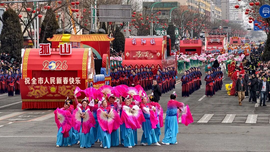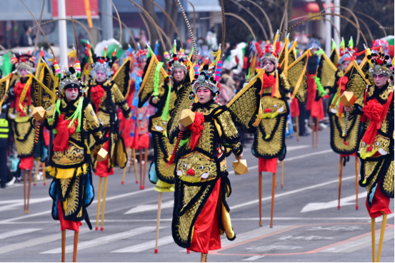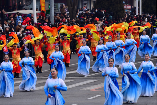 十字街镇秧歌队率先出场,队伍前的机器人成为全场亮点,它们踏着精准的机械舞步,与传统秧歌韵律奇妙交融。