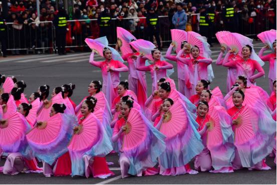新城街道“龙马新渔耕”秧歌队粉裳映霞、彩扇生风,演员们随旋律振臂起舞,以龙马之姿展新城风采。