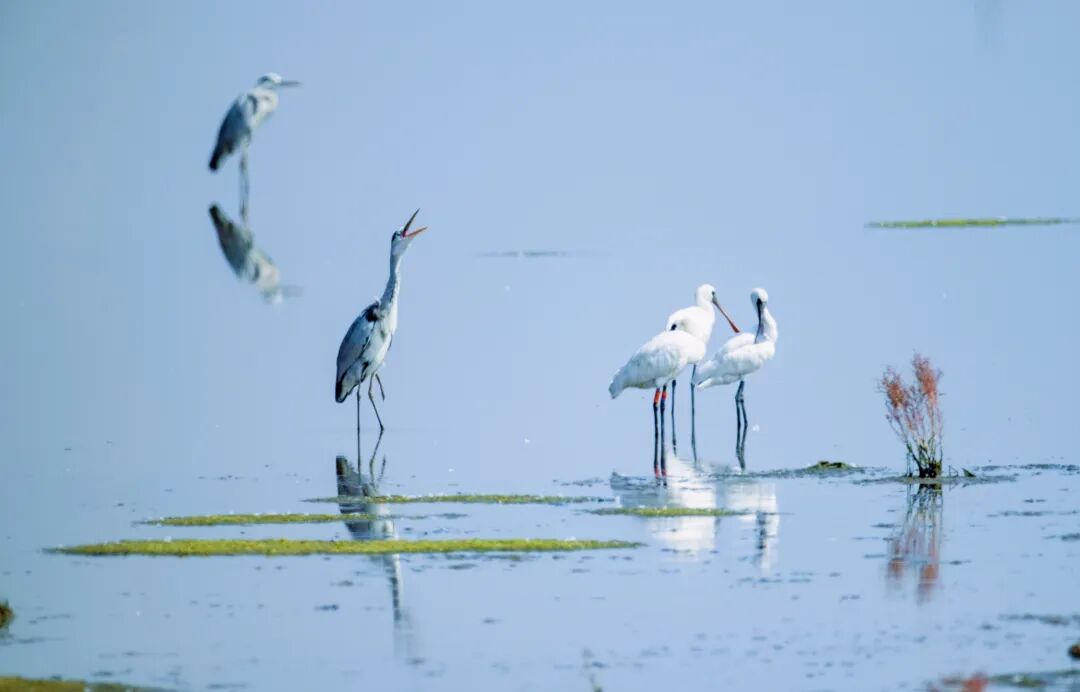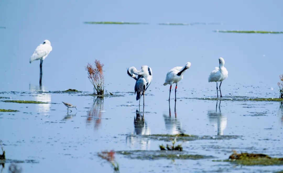 成群的黑脸琵鹭、黑腹滨鹬、环颈鸻、黑翅长脚鹬、蛎鹬、苍鹭等珍稀水鸟或在滩涂上觅食,或在空中嬉戏,为这幅天然彩色画卷注入了无限生机。