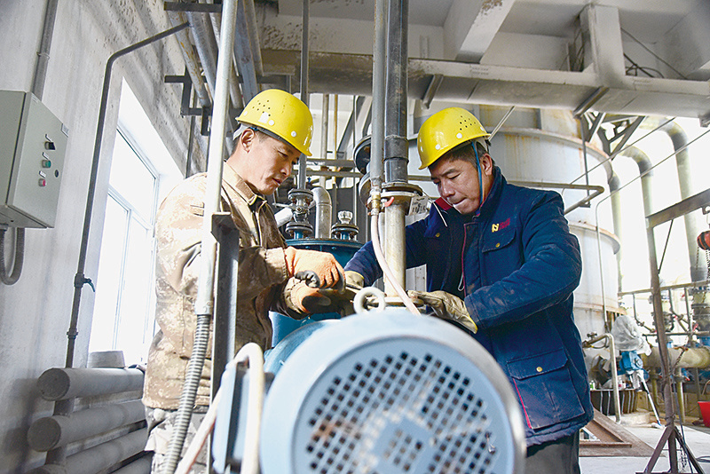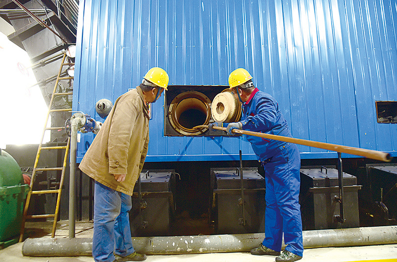 在锅炉房内,检修人员正对锅炉的炉排、螺栓、开关等部件进行全面检测。