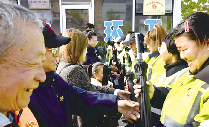 活动现场,志愿者们将印有“致敬城市守护者”字样的定制便携雨伞,送到环卫工人手中,希望能方便他们雨天作业。环卫工人代表为818志愿服务队领队花建东颁发“荣誉环卫工人”证书及环卫工人工作马甲,感谢他连续五年组织开展关爱环卫工人活动。
