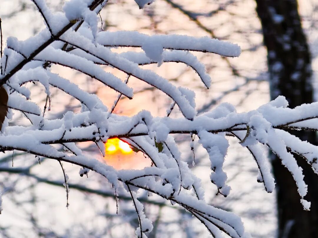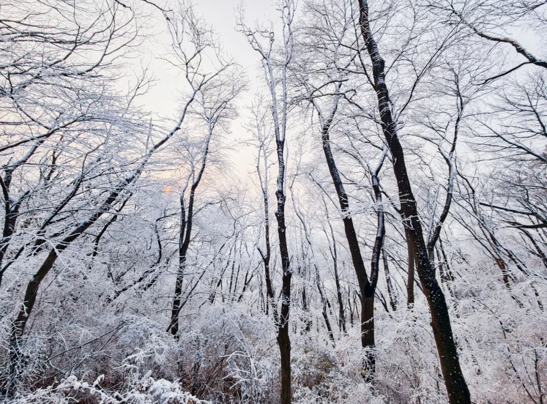 空气中充足的水汽在低温中凝结,为树木披上了一层晶莹洁白的“冰衣”,在阳光的照射下闪烁着银光。