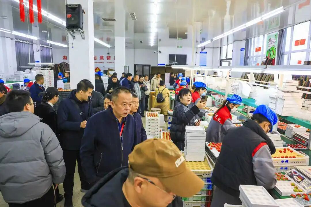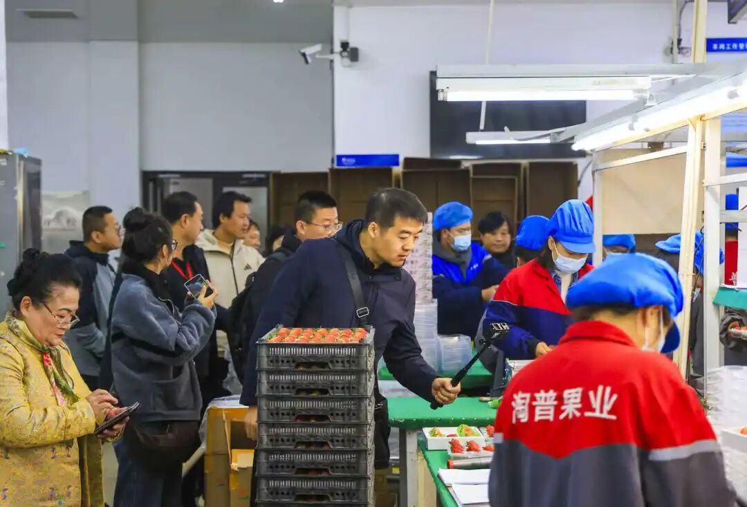 随后,考察团来到淘普农业发展有限公司。车间内,百余名工人将从农户收购的草莓,根据客户要求的果形、大小等标准进行分拣、包装,随后发往全国各地。