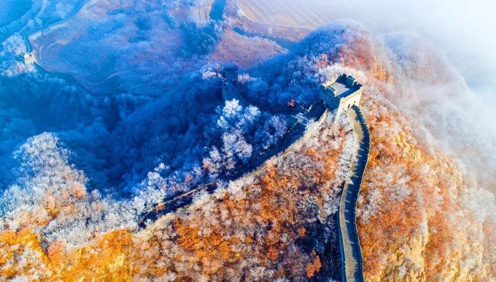 登上虎山长城,白雪覆盖的城垣蜿蜒于山脊之上,砖石与雪色交融,历史的厚重与自然的灵动在此刻交织成一幅壮美画卷。