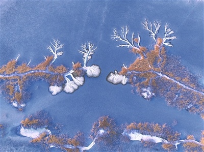 “潮汐树”是潮滩在海水每日往复冲刷下,自然形成的沟壑系统,状如大树,具有重要的潮水排水、滋养生物等功能。这道自然奇观的形成有赖于近年来辽河口加大湿地保护力度,划定生态红线,实施湿地生态补水、植被修复、野生动物保护等工作,使湿地保持了完整的自然演替过程和健康的潮汐韵律,这正是“潮汐树”得以清晰保存并冬季凝冰成景的关键。