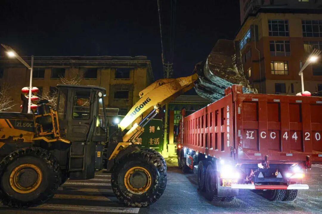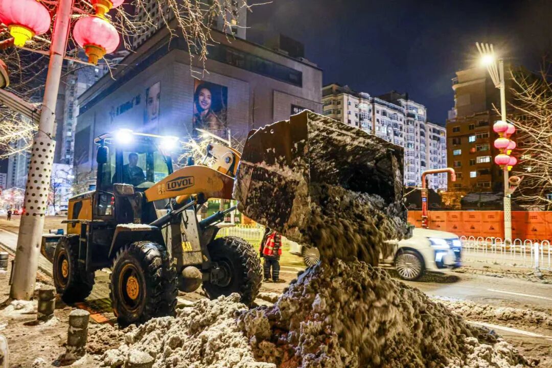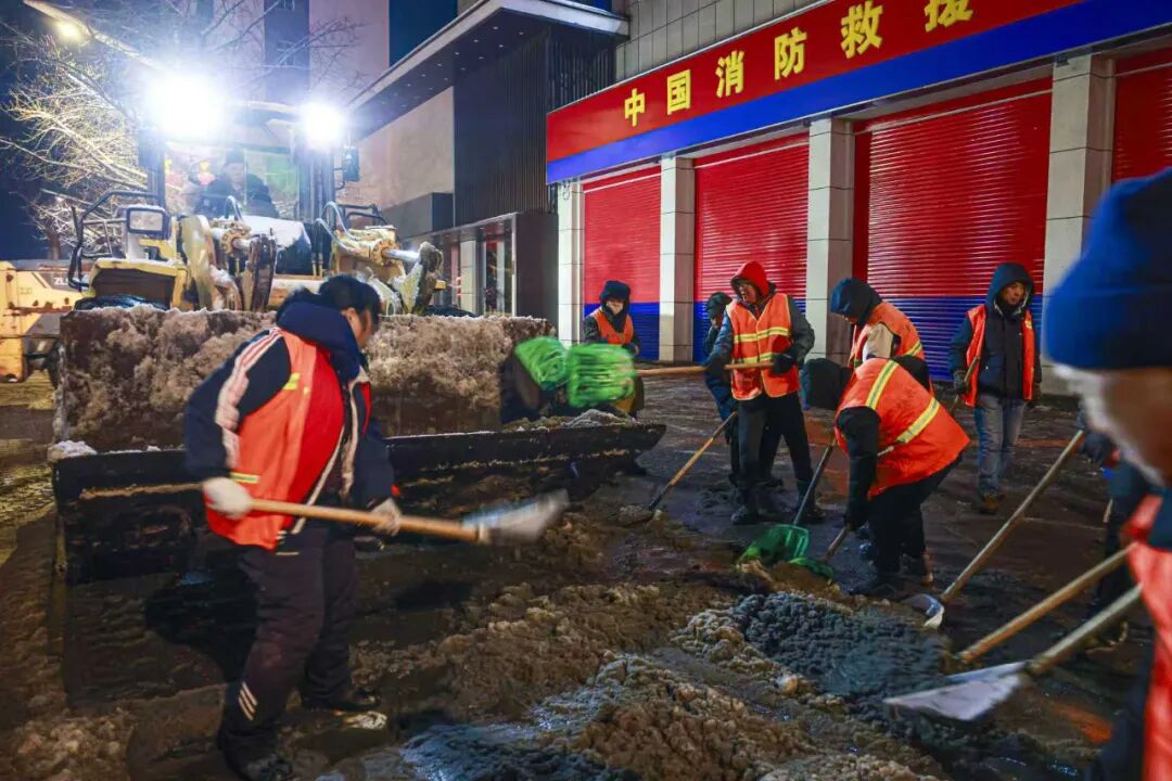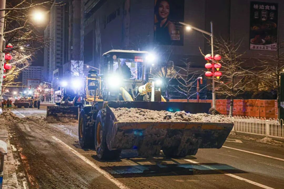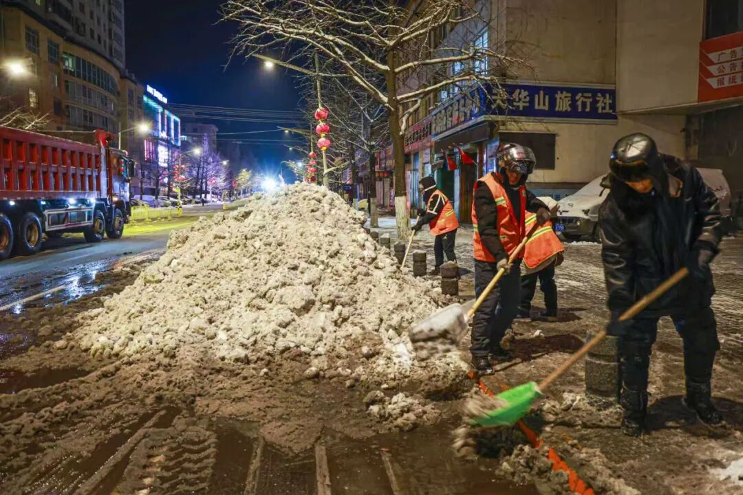 寒夜中,橘色身影与铲车灯光交织,成为街头最温暖的风景线。经过连夜奋战,辖区内道路积雪得到有效清除。