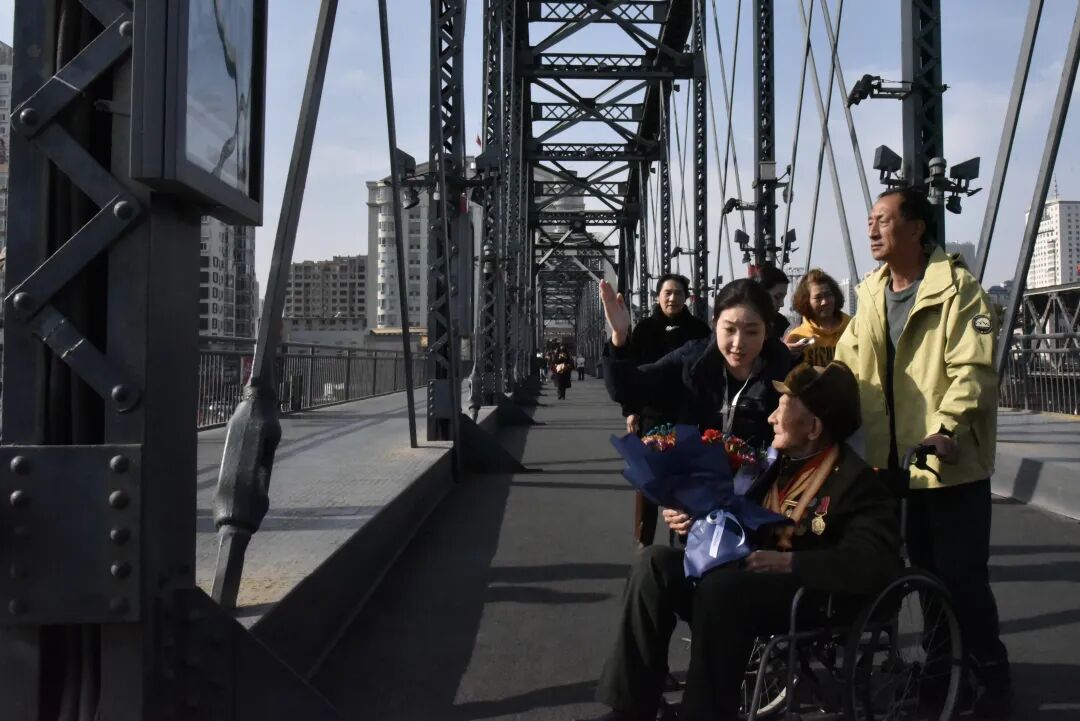 近日,97岁唐山籍志愿军老战士刘志在家属的陪伴下,再次踏上丹东鸭绿江断桥,与游客、工作人员共同缅怀牺牲的战友,一场跨越时空的爱国主义教育在英雄城市生动上演。